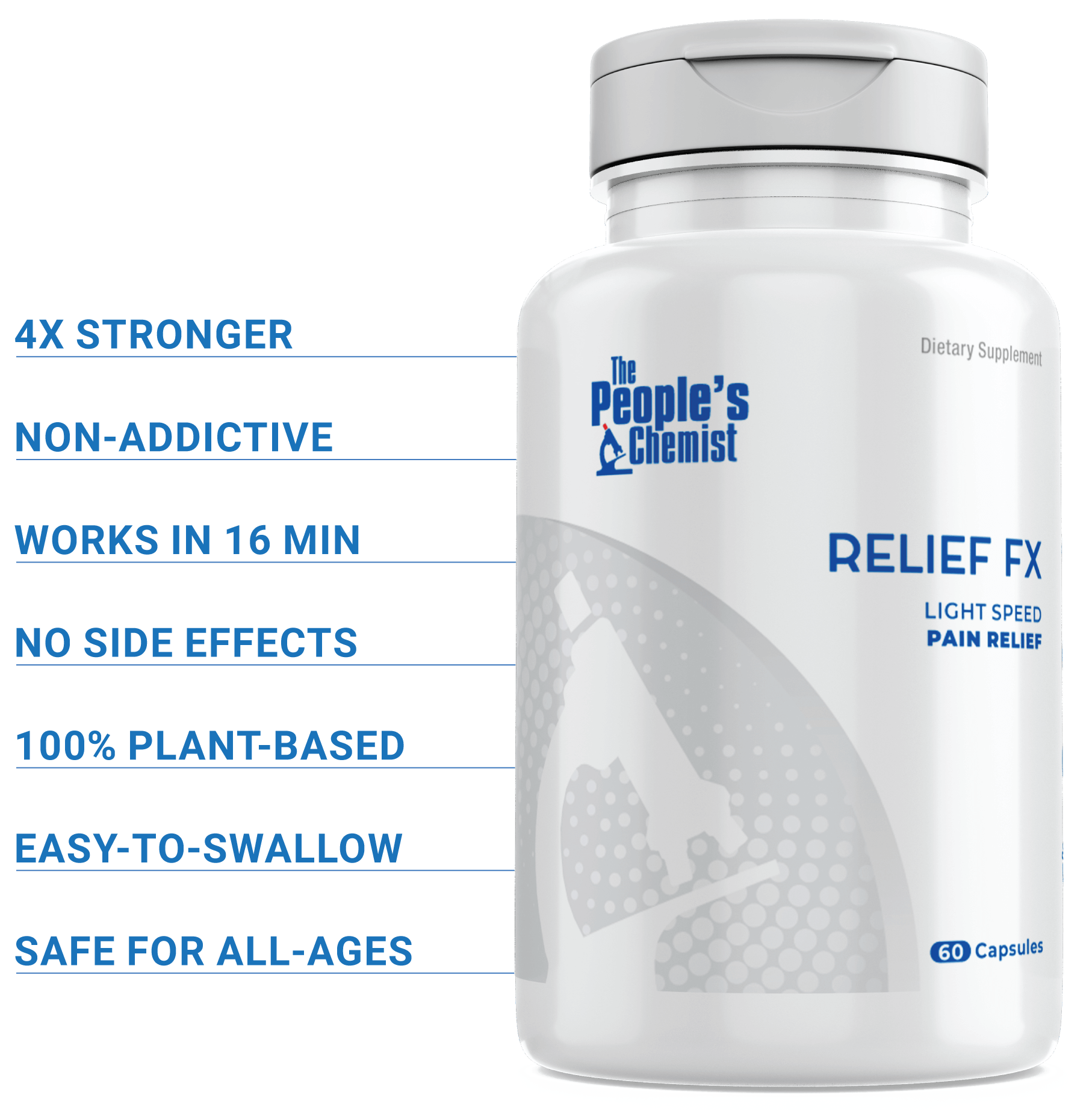Aspirin and NSAIDs cause gastrointestinal damage and stomach ulcers, but Relief FX is neither and therefore will not trouble your stomach. As a matter of fact, The People’s Chemist recommends taking it on an empty stomach for faster results. It can be taken with food, if you forgot, but food will slow the absorption and hence, the relief. It is best to take when hungry.
